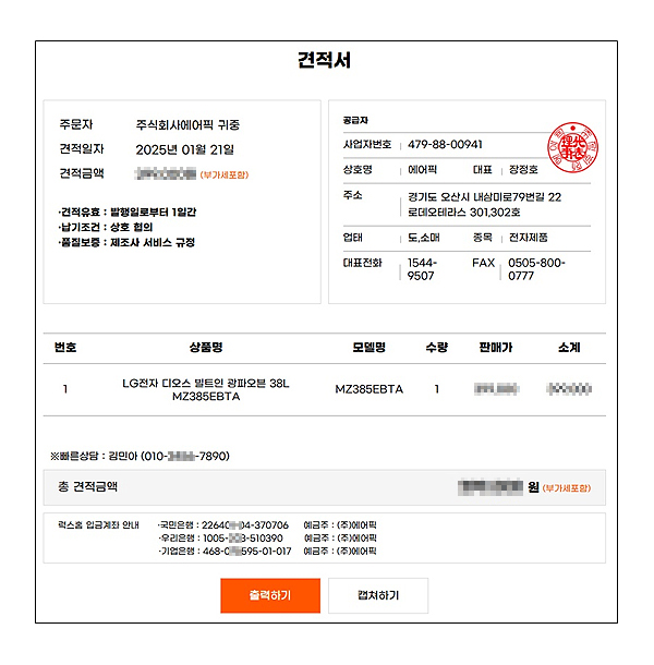 필요한 상품을 장바구니에 담은 후, [견적서 출력] 버튼을 클릭하여 선택한 상품의 견적서를 출력 또는 캡쳐할 수 있습니다. 상담 및 견적 과정에서 업무를 보다 간편하게 처리할 수 있습니다.